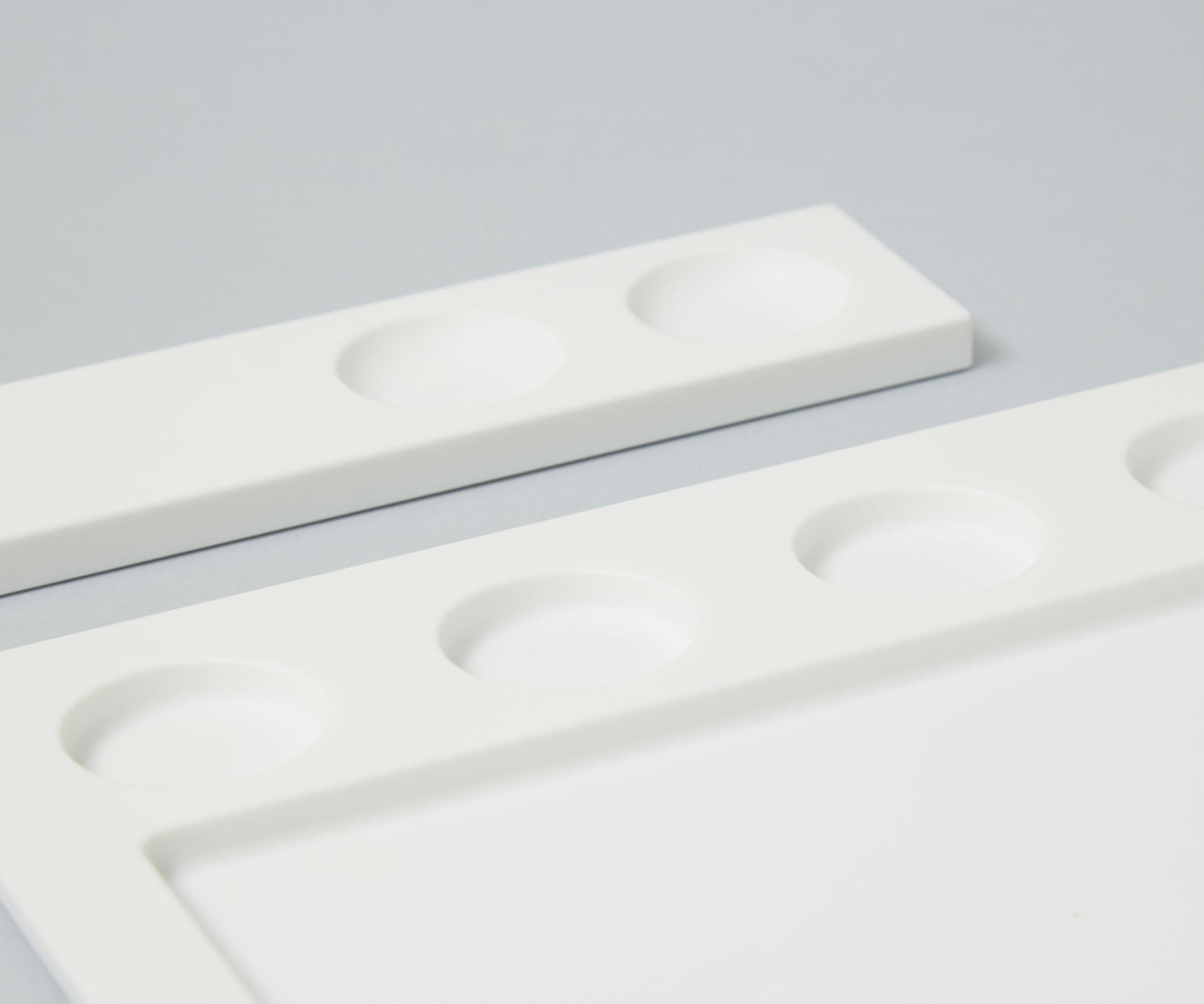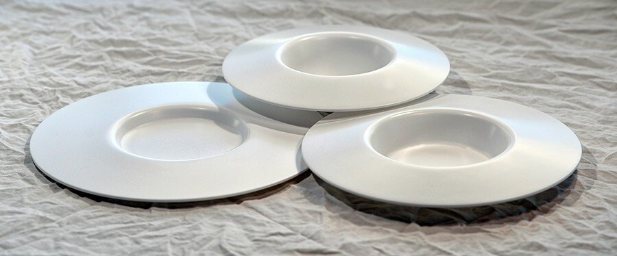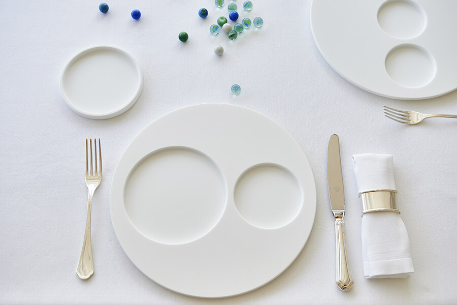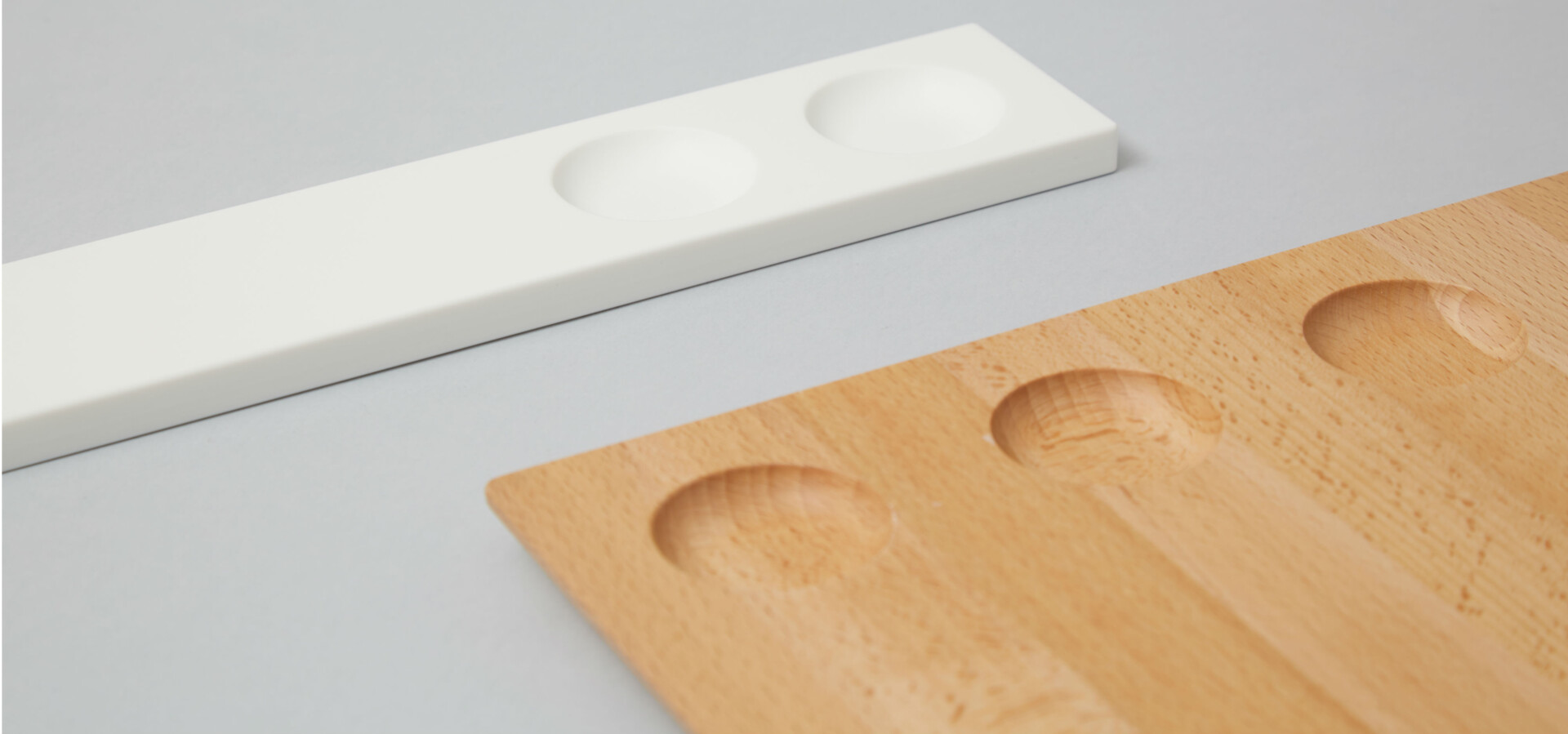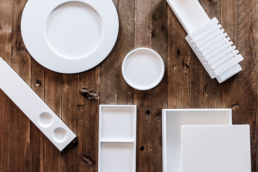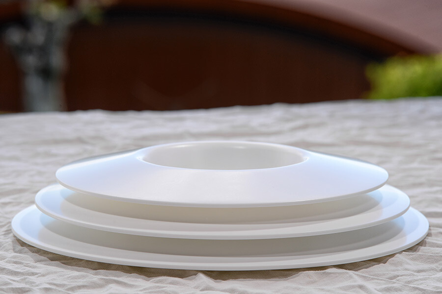 Materiali, uporabljeni za izdelavo krožnikov Infinito Design, predstavljajo popolno združitev klasičnega in sodobnega: les se prepleta in združi z naprednimi materiali, kot je Krion K-Life Solid Surface – kompozitna smola, certificirana za stik z živili, z izjemnimi funkcionalnimi in estetskimi lastnostmi, ki se pogosto uporablja pri izdelavi ravnih in ukrivljenih površin.